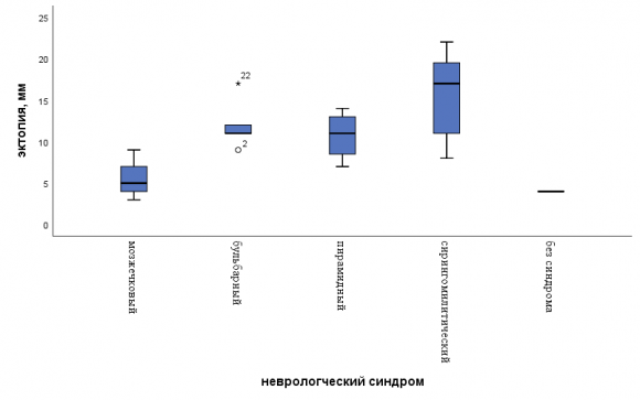After analyzing the above complex of subjective and objective neurological symptoms in patients with type I Chiari anomaly, we identified 4 types of clinical syndromes -cerebellar, bulbar, pyramidal, syringomyelitic, which were most clearly formed in groups of patients. The distribution of these syndromes in patients with AK type I, depending on the degree of displacement of the cerebellar tonsils below the Chamberlain line, is proposed in Table 1 (Fig. 2). As can be seen from the presented data, cerebellar syndrome with clinical symptoms of dizziness, tinnitus, various types of nystagmus, static and dynamic ataxia phenomena most often occurred in patients of the ? and ? groups with tonsil descent to 5-9 mm and accounted for more than half of the cases (58.8% and 52.0% respectively). The representation of cerebellar syndrome in patients of the ? and ? groups was significantly less. So, with severe tonsil ectopia of 10-15 mm, the cerebellar syndrome was observed in 12 (14.3%) patients, and in the group with ectopia of more than 15 mm, it was observed in only 2 examined individuals. Such a low number of patients in the ? and ? groups with manifestations of the cerebellar syndrome, in our opinion, is associated with the intactness of the cerebellar pathways with a pronounced displacement of the cerebellar tonsils.