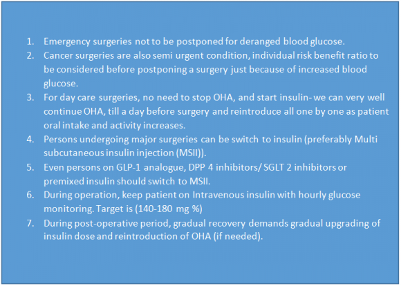 Now it is recommended not to stop oral hypoglycemic agents till day before surgery as we used to do previously except for SGLT 2 inhibitors. ( 5) If blood glucose is fairly controlled then we can continued with these medicines, otherwise it is prudent to switch to insulin. Use of Insulin has few merits and demerits as explained in the box 1. Most hospitals has their own insulin regimen for control of blood glucose in perioperative period depending upon the practices and insulin sensitivity of the individuals. ( 6)
