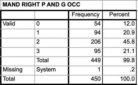 There were 450 patients consisting 288 males and 162 females age between 14 to 25 years with mean age of 19.62 years (SD =2.575). Table 1 illustrates type of impaction. In the mandibular arch (left), Mesioangular impaction was the most frequently seen (38.4%) followed by horizontal (38%), vertical (8.9%) and distoangular impaction (3.3%). In the mandibular arch (right), Mesioangular impaction was most frequently seen (37.1%), followed by horizontal impaction (28.2%), vertical (10%) and distoangular impaction (12%) as shown in Table 2. Table 3 shows type of impaction in the maxillary arch (right), the most frequently impacted third molar was found to be in horizontal angulation (49.1%) which is followed by distoangular impaction (27.1%), mesioangular impaction (5.8%) and (0.2%) vertical impaction. In the maxillary arch (left), the most frequently impacted third molar was found to be in horizontal angulation (46.2%), which is followed by distoangular impaction (26.4%), mesioangular (8.9%) and vertical impaction (0.2%) as shown in table 4.