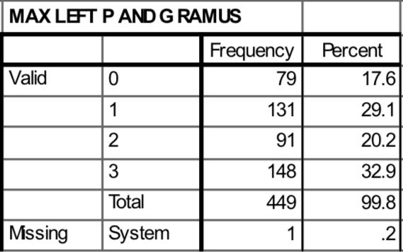 Table 1: Angulation of impaction of mandibular third molar on the left side (1) mesioangular, (2) distoangular, (3) horizontal, (4) vertical According to level/depth of impaction (Pell and Gregory), in the maxillary arch (left) level3 was most abundant (33.1%), followed by level 1 (31.6%) and then level 2(17.6) as shown in table 5. According to level/depth of impaction (Pell and Gregory), in the maxillary arch (right), level 3 was most abundant (33.6%), followed by level 1(32%) and then level 2 (16.4%) (table 6). According to level/depth of impaction (Pell and Gregory), in the mandibular arch (left), level 2 was most abundant (34.2%), followed by level 1(28.4%) and then level 3 (25.8%) as shown in table 7. According to level /depth of impaction (Pell and Gregory) for mandibular arch (right), level 2 is most abundant (45.8%), followed by level 3 (21.1%) and then level 1 (20.9%) (table 8). According to the ramus relationship to the third molar (Pell and Gregory) in the maxillary arch (left), most abundant is Class III (32.9%), followed by Class I(29.1%) and then class II (20.2%) as shown in table 9. According to the ramus relationship to the third molar (Pell and Gregory) in the maxillary arch (right), most abundant is Class III (33.3%), followed by Class I(32%) and then Class II (16.7%) as shown in table 10. According to ramus relationship to the third molar ( Pell and Gregory) in the mandibular arch (left), the most abundant is Class II (41.3%) , followed by Class III (24.2%) and then Class I (23.1%) as shown in table 11. According to ramus relationship to the third molar (Pell and Gregory) in the mandibular arch (right), the most abundant is Class II (49.1%), followed by Class III (19.8%) and then Class I (18.9%) as shown in table 12.