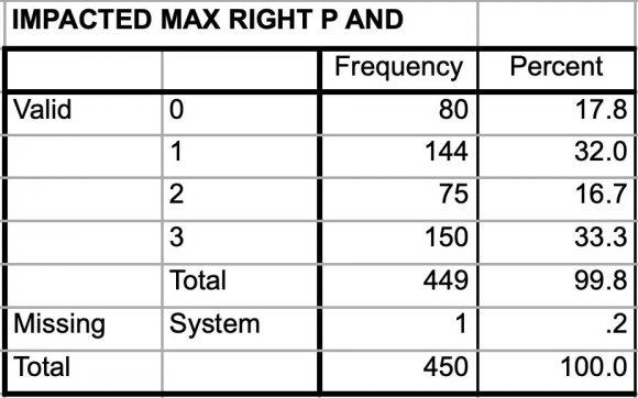 A large population of individuals may have one or more impactions. The prevalence and types of impactions vary in different racial and ethnic groups. These may be due to racial genetic characteristics, inbreeding as well as epigeneric factors such as food habits. It is therefore important to understand the pattern of impactions in various communities and population sub-groups. (9) This study was undertaken to study the prevalence and pattern of impactions in the Punjab population. Orthopantomographs were taken of 450 subjects from Ludhiana district who consented to participate in our study. Only those subjects who confirmed to the inclusion and exclusion criteria outlined previously were selected for the study.