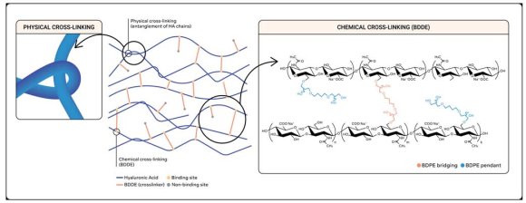 Hyaluronidase naturally occurs in various organs (such as the testis, spleen, skin, eyes, liver, kidneys, uterus, and placenta) and body fluids (tears, blood, and semen). There are six known types of hyaluronidase (hyaluronidase 1-4, PH-20, and HYALP1). Hyaluronidase 1, encoded by the HYAL1 gene, is prevalent in major organs Figure 4: This schematic representation illustrates the differences between natural, cross-linked HA and the process of physical crosslinking. Natural HA: represented by the blue line as a linear molecule composed of repeating disaccharide units. Cross-Linked HA: represented by the blue line connected by the orange, at higher magnification, in which there are additional, BDDE ou BDPE connecting bonds between HA chains. These bonds, often formed through chemical processes, create a network or matrix. Crosslinking enhances the stability and longevity of HA fillers when used for cosmetic purposes. The degree of cross-linking can vary, influencing the gel's cohesiveness and resistance to degradation. Physical Crosslinking: is a technique that allows for HA modification without the use of chemical agents, such as changes in temperature, pH, or the application of external forces to induce cross-linking.