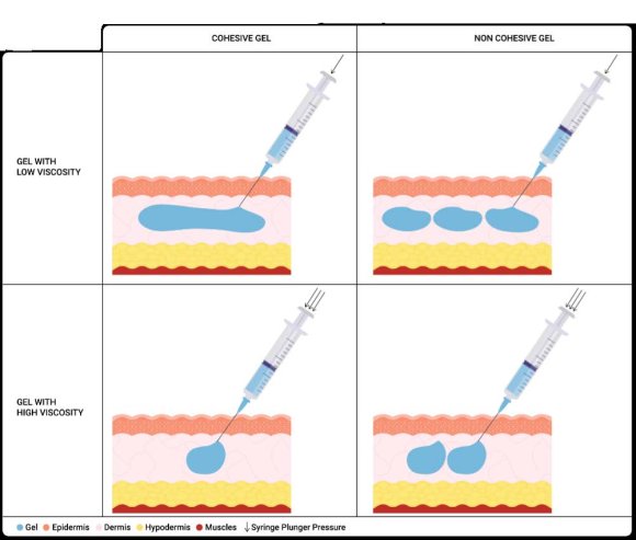 Figure 6: Schematic representation of the cohesion and viscosity of an HA gel reveals a pivotal correlation. The gel's fluidity is greatly enhanced by its low viscosity and low cohesiveness, which results in a lack of unity. On the other hand, a gel that has low viscosity but high cohesiveness maintains its structural integrity while still remaining fluid. This balance also influences the level of force necessary to extrude the gel through a syringe and needle. When examining a filler with high viscosity and strong cohesiveness, it manifests as a denser and more cohesive gel, demanding greater force for extrusion. Conversely, in the absence of cohesiveness, the gel fails to maintain its unity after being injected into the dermis. In summary, the delicate balance between viscosity and cohesiveness significantly influences both the physical properties of the gel and its performance during injection, shaping the final outcome in dermal applications.