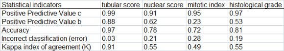 The tubular, nuclear, and mitotic index scores, which together define the histological degree of malignancy in breast cancer, were determined. The statistical parameters of Predictive Values, Accuracy, Error, and the Kappa Index of agreement between the pathologist and the medical program analyzer, were also used in this phase. The programs Tanagra and Med Calc were used for statistical processing. The statistical parameters gathered were used to determine the histological degree of malignancy.
