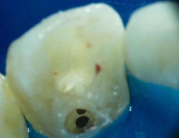 Also, there were signs in favor of internal resorption. The defect was below the cervical part, which is not typical of external cervical resorption. The response to cold stimuli reduced, which is not characteristic of external resorption, as it affects the pulp only in the last stages of tooth structures decay. Furthermore, the X-ray obliteration of the root canal beyond the resorption area is not characteristic of external resorption. Visit 1: Pre-op X-ray plus anesthesia with sol. Ubisthesini 4% -1 ml, isolation with rubberdam. The access was made as close as possible to the incisal edge. When opened, at first glance the pulp chamber looked quite II.