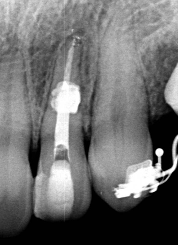 The patient started orthodontic treatment, however, tooth 2.2 was temporarily not included in the orthodontic therapy at the endodontist's request, who was willing to observe it for a year. Furthermore, increased resorption could have been provoked. As of today, the tooth is included in the orthodontic treatment and is being followed up.